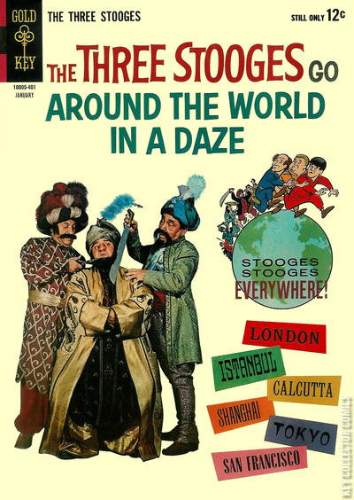 Comic is adaptation of the 1963 movie "The Three Stooges Go Around the World In A Daze." Inside front cover features photos from the movie. Issue also has backup feature Professor Putter in "The Instant Knowledge Machine," one-page text feature "N- Yuk! N-Yuks!" and one page gag strips.