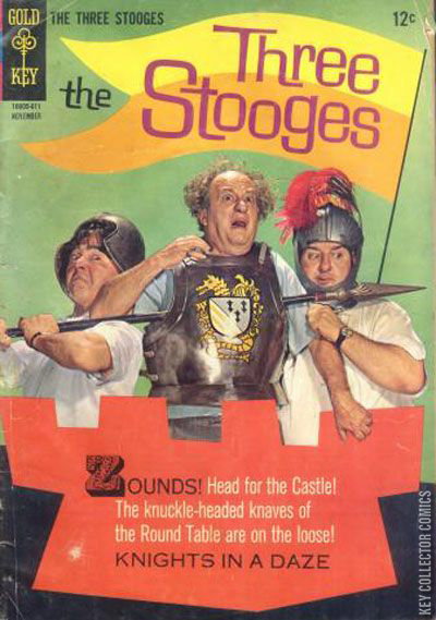 The Three Stooges in "Knights for a Daze" in which the Three Stooges become "knights errants" for King Arthur of Camelot and "Clonked in the Clink." Issue also has backup feature The Little Monsters in "The Space Face Thief," one-page text feature "Dear Stooges" and one-page gag strips.