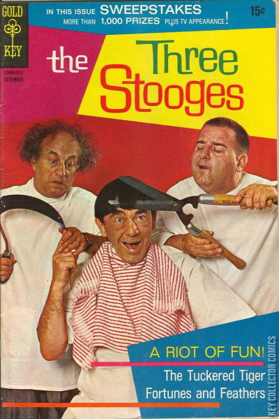 The Three Stooges #45 - The Tuckered Tiger ; Fortunes and Feathers released by Gold Key Photo on cover. The Three Stooges in "Fortunes and Feathers" and "Wild Welcome," reprints from earlier issues and new story "The Tuckered Tiger." Issue also has a reprint of backup feature "The Little Monsters" one-page text feature "N-Yuk! N-Yuks!" and Gold Key Comics Club News features. No story/art credits given. 36 pages, full color. Cover price $0.15.