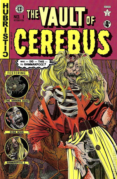 First annual HALLOWE'EN SPECIAL because a) it's an EC Horror parody and b) unlike everyone else's Hallowe'en Special it will actually come out in October! Featuring not only Benjamin Hobbs' sequel to THE VARKING DEAD (March, 2020) featuring Batvark and the previously UN-BEDDABLE VARK (who is now fornicating like crazy with the Varking Dead and only qualifies as 'un-beddable' because no beds are involved) but also featuring two big 7-page gammakpooz stories written by Dave Sim, 'I, gammakpooz!' and 'gammakpooz and me' (which is already pretty schizo and let's face it, Hallowe'en is all about being schizo! Am I right? You are! You're right! Yes, I am! Yes, you are!) featuring multiple uses of the previously unpublished variant glamourpuss zombie cover! So many uses, in fact, Spot The Unpublished Zombie Cover could become the next hot university campus drinking game. Featuring a two-panel cameo, way at the end, by the title character! Get it? We're keeping CEREBUS in a VAULT!!