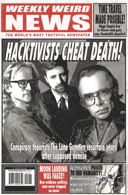 The event of the year begins here! When The Lone Gunmen discover Internet files from future, they learn that a plague will soon wipe out most of humanity. With Agents Mulder and Scully working one lead, the Gunmen must spring into action and investigate several urban legends: a group of ghost-hunters, mutant turtles that live in the sewers, shape-changing alien robots, and a vengeful spirit from beyond the grave!