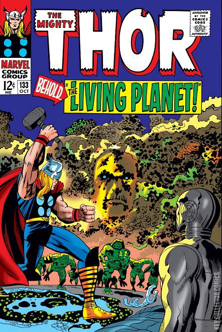 Ego and the Recorder guest star in "Beyond the Living Planet!" Script by Stan Lee, pencils by Jack Kirby, inks by Vince Colletta. "Tales of Asgard" back-up: "Valhalla!" Script by Lee, pencils by Kirby, inks by Colletta. Kirby/Colletta cover.