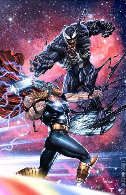 VENOM OF ASGARD, PART ONE Donny Cates writes Venom once again, alongside guest artist Salvador Larroca ! In this team-up of kings, Thor, King of Asgard, and Eddie Brock, King in Black, must set aside their personal differences to save the one thing they both love: Earth! LEGACY #753