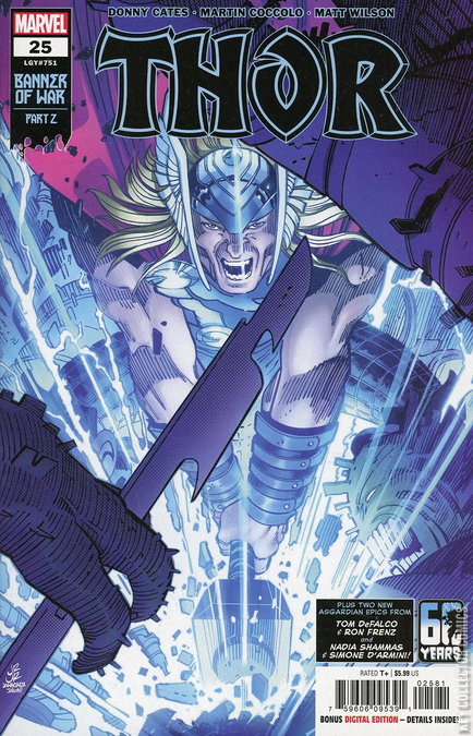 BANNER OF WAR, PART TWO / IF THIS BE MERCY! / THOR'S WEDDING The 60th Anniversary celebration—and Thor and Hulk's epic rivalry—continues in the second installment of the crossover between the HULK and THOR series! Banner's newfound control of his rage is prolonging this fight more than Thor expected, and with Banner holding his own, Thor must get creative. Odin's breakthrough look into Banner's psyche seems to slow the violence, but will it be enough? Additionally, new creators to the THOR title bring glimpses into the possible futures of Thor and his friends! LEGACY #751 | CONTINUED FROM HULK VS. THOR: BANNER OF WAR ALPHA #1 / CONTINUED IN HULK #7