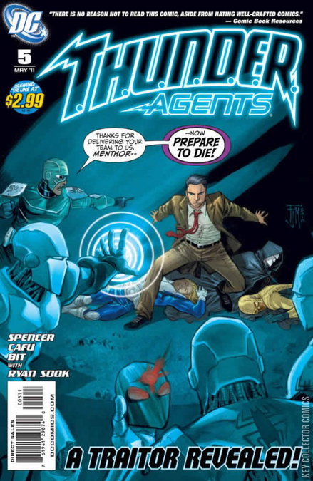 Believe the buzz! T.H.U.N.D.E.R. AGENTS continues to deliver the kind of action-packed, espionage-filled tales you won't find anywhere else in the DCU! This issue spotlights Menthor - a.k.a. Toby the Salesman. If you think you know Toby, well, you're wrong, and in a sequence illustrated by Ryan Sook, boy will you see why! Nick Spencer and CAFU turn everything on its head this issue, as the secrets behind both Spider and T.H.U.N.D.E.R. finally start to come to light.
