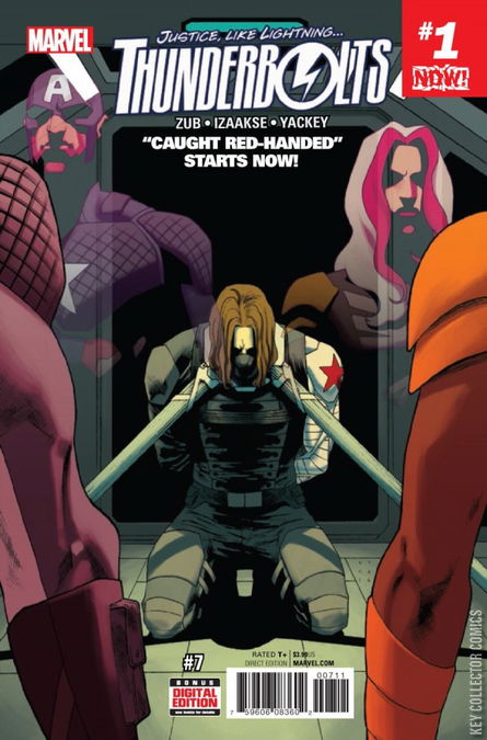 "CAUGHT RED-HANDED" STARTS NOW! Operate in the shadows long enough, someone is going to shine a light on you. Bucky didn't think that person would be his best friend, Steve Rogers. Captured and separated from his team, Bucky is on his own. Where do his loyalties lie? Steve wants to know. Only Steve has secrets of his own. Plus, an original Thunderbolt returns! How will Songbird react to the reunion of her former team?