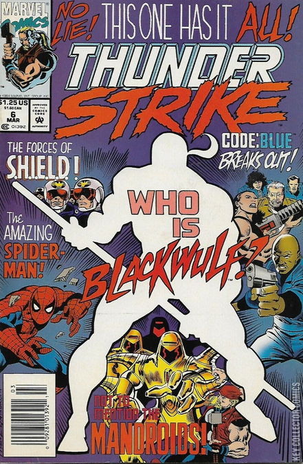 THE HIDDEN WAR! Thunderstrike, Spider-Man, and Jock Jackson are talking to DePaul when Stellaris shows up and things go straight to hell. They manage to fight off the Mandroids until Nick Fury shows up and stops the skirmish. Inside the Helicarrier, Stone and the rest of Code:Blue manage to escape and make a copy of S.H.I.E.L.D. files pertaining to Tantalus, Blackwulf, and a secret war that's being waged underground. Thunderstrike and Code:Blue go underground and get caught in a battle between Tantalus' agents and Blackwulf. Blackwulf tells them that he must go, but he left them a present - Pandara all tied up.