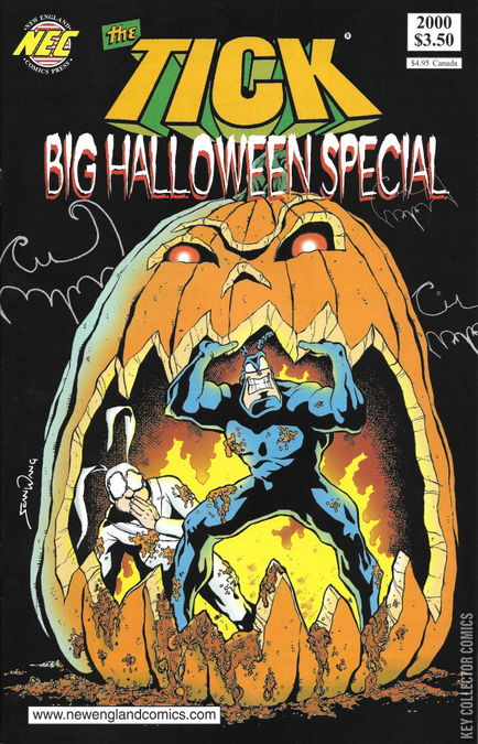 It's Halloween Day in The City, and The Tick and Arthur are shopping for a pumpkin to carve into a jack-o-lantern. Much to their shock, they discover that the local farmstand has been overrun with living pumpkins! These sinister jack-o-lanterns pull their roots out of the ground, grin sinisterly, and crawl about attacking the good citizens of The City! They want a leader... and there just happens to be a prized 500-pound pumpkin on display at the Annual Tri-County Fair! Can The Tick and Arthur stop these melons of menace? And what of the U.S.D.A. Extension Agent? Will he help or hinder our heroes? Find out in "The Orange Teeth of Horror!"