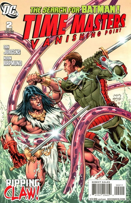 "The Search for The Batman!" part 2 of 6! Already lost in the time stream while searching for the missing Caped Crusader, Rip Hunter and his ad hoc Time Masters (Booster Gold, Superman and Green Lantern) may not live long enough to make it out of the barbaric age they find themselves sidelined into. Will Claw the Conqueror be able to help them or will he be their doom? You won't want to miss this companion series to the highly anticipated BATMAN: THE RETURN OF BRUCE WAYNE!