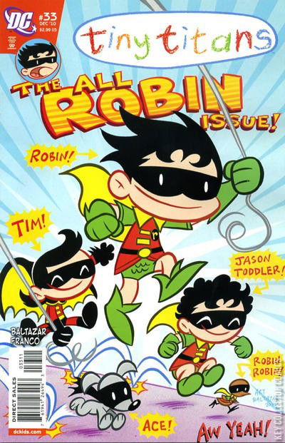The all-Robin issue! What does The Boy Wonder do when there's more than one Robin walking around? Time to bring out the Nightwing costume, of course! Maybe a name change will be less confusing this time? Guest-starring Tim and Jason Toddler, Alfred, Ace and the Robin Robin!