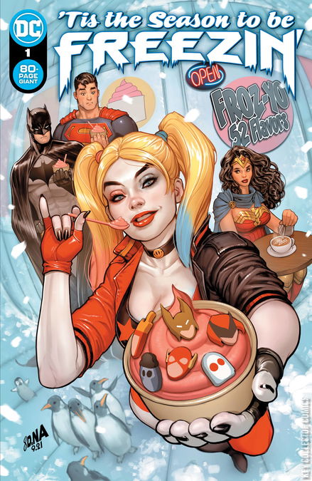 ONE SNOWY NIGHT / THE SYPHONING / BIZARRO V. SEASONAL DEPRESSION: DAWN OF CLIMATE CHANGE! / BIZARRO LOVE HOLIDAY / SNOW DATE / A CHANGE OF HEART / THE HOLIDAY PACT / BREAK THE ICE Oh the weather outside is freezing, but these stories sure are pleasin’. So since you’ve no place to go, why not grab a sweater, pour a cup of hot cocoa, and stoke the fire…because these 10 tales are sure to lower the mercury! Join us as Harley Quinn and Blue Snowman ice out Hawkman, Batman fights the cold heart of Mr. Freeze, the JLQ don’t stand a snowball’s chance against Minister Blizzard, and the Flash and Superman team up to chill out Captain Cold. So warm your holiday heart with these freezin’ feats of frosty fiction!