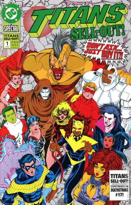 THE TITANS $ELL OUT $PECIAL (OR THE BUCK STOPS HERE!) Continued from Team Titans #3 Mired in a public relations nightmare, the team decides to 'sell out' by approving action figures, a feature film and...the Teeny Titans cartoon... Continues in Deathstroke The Terminator #17