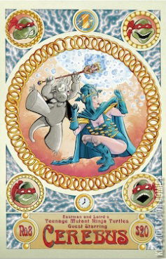 Team Up with Cerebus :� This story begins as Renet, the apprentice to time master Lord Simultaneous, "borrows" her boss' sceptre that contains the "sacred sands of time." The wand allows its wielder to be taken anywhere in time and space by merely wishing to go. Just as Renet grasps the sceptre, she is discovered by Simultaneous, who is not happy with her. In fear and desperation, Renet wishes to be sent to New York, circa 1986.� As the Fates would have it, Renet is transported to a rooftop in New York City, where the Turtles are goofing around. Renet quickly makes friends with the boys when they're suddenly interrupted by an enraged Lord Simultaneous. Renet wishes to be taken "anyplace on Earth before humans recorded time!"� Back in the past, we find Cerebus being awakened by his henchmen. It seems that the men are uncomfortable with the aardvark's plan to invade a foreboding castle and so they announce their plan to desert him. Cerebus threatens them and tries to get back to sleep, when Renet and Turtles emerge through a portal in a flash of magical light. As the Turtles struggle to their feet, we see that within the castle a satyr-like being awakes, alerted to the presence of the Time Sceptre.� Leo apologizes to Cerebus for crash landing in his camp, but the aardvark is in no mood for discussions. As the two prepare for battle, Renet tells them to chill out and offers to explain everything. While Renet tells the tale of why she's bouncing through time (she was bored), Savanti Romero (the satyr-like dude) and his army rush out of the castle to fetch the Sceptre.� Our heroes hear the approaching warriors too late, and while they make efforts to escape, Savanti easily overcomes them with magic and takes the Time Sceptre. The wizard and his men retreat back to the fortress and leave our heroes unconscious on the ground.� A few hours later, the TMNT, Renet and Cerebus find a town and go into a tavern. Cerebus arranges for a mercenary force to attack the castle at dawn by lying to them. The next morning...