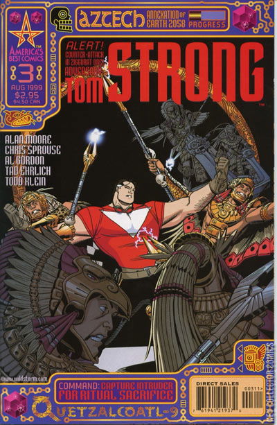 "Aztech Nights" In the thrilling third issue of America's Best Comics' flagship title, the pulp-science- fiction powerhouse finds marvelous Millennium City? And indeed his entire Earth? Menaced by the trans- dimensional terror of the Aztechs! In the first appearance of these sun-worshipping cyber-conquerors from a parallel world, Tom Strong must fight alone within the golden Ziggurat of Fear as he struggles to survive the perils and pitfalls.