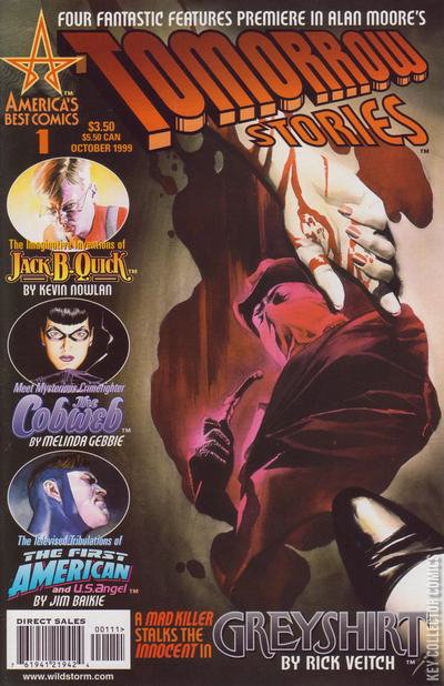 Dive in to this first issue featuring four fantastic stories from author Alan Moore! Meet inventor Jack B. Quick as he creates a galaxy in his own hometown--terrorizing the family cow in the process! See a madman cornered and captured by Greyshirt...with a twist! The First American and U.S. Angel face off against an insidious enemy--daytime talk shows! And finally, meet sultry crime-fighter The Cobweb. Will she be able to free captured beauties, even as she's turned into a doll?
