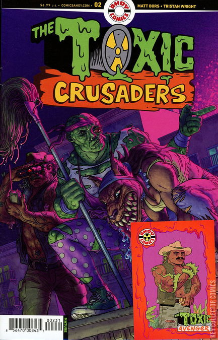 The Crusaders revival barrels on, backed by a new video game and Toxic Avenger movie! Tarred as terrorists, Toxie and his teammates pursue Mister P, a covert extraterrestrial invader posing as a finance exec—who seeks to serve his masters by manipulating the world economy into permanent oblivion. Polybagged with exclusive trading card