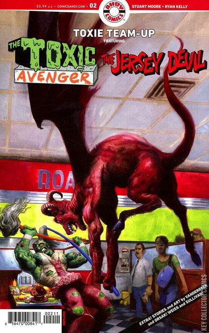 Continuing the Toxic Avenger’s tour of what we laughingly call the AHOY Universe! Following his meeting with Jesus Christ, the Avenger returns to his roots for an epic brawl with the Jersey Devil in—where else?—a sinister diner. Script by the Garden State’s own Stuart Moore (Captain America for Dummies) with art by midwestern interloper Ryan Kelly (Local, Dead Boy Detectives) and cover by master Toxie artist Fred Harper!