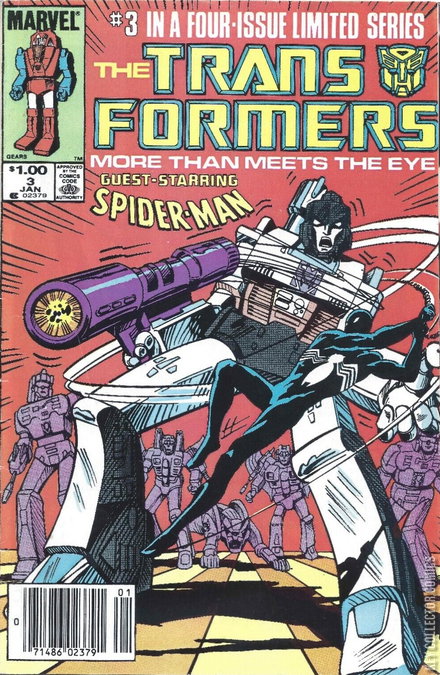 As the Transfomers' battle escalates, Peter Parker jumps into the fray to save the day as Spider-Man. The trouble is, he doesn't understand the difference between the heroes and the villains.NOTE #1: Spider-Man appears here in his alien black suit symbiote, as seen in Secret Wars. Although Peter is completely in control in this story, this is the same alien symbiote that will eventually become Venom.NOTE #2: Spider-Man (in his traditional red outfit) would face off against Megatron again in New Avengers/Transformers. While Peter was from the same Marvel continuity, the Transformers were from a different continuity in IDW, so no mention is made between them of their previous meeting.