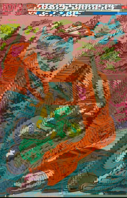 CYBERTRON INFESTED! The Transformers’ homeworld is crawling with tiny green invaders from the planet Earth—the G.I. JOE team! Also this issue—Funeral for a Friend. Many AUTOBOTS and G.I. JOE soldiers have fallen in the line of duty—but you've never seen a send-off like this!