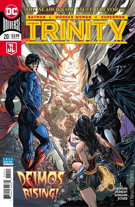 'MAN DOWN' part one! As the Trinity deals with the fallout of the battle for Skartaris, each set out to search for the missing Steve Trevor. But looming on the horizon are the magical armies of Deimos and their plan to lay siege to the entire planet! Deimos' true goal will bring Superman, Batman and Wonder Woman to their knees!
