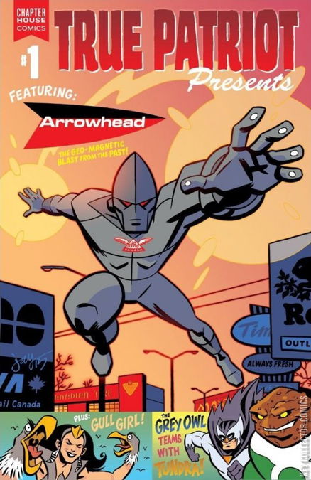True Patriot , the anthology of Canadian superheroes returns in the premiere issue. PHASE ONE: TEST FLIGHT The amazing adventures of Arrowhead continue. A LESSON IN THUNDERLAND! A True Patriot team-up featuring Grey Owl and Tundra from the Family Dynamic. HAIL TO THE GULL The origin of Gull Girl.