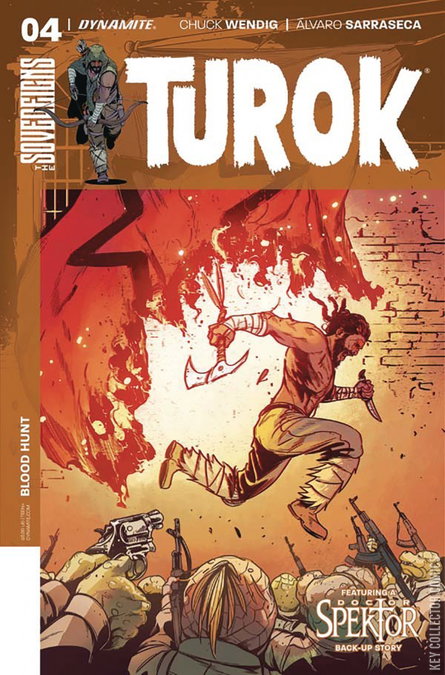 Captured by cultists and recruited by rebels! The mystery of Turok's past is illuminated as he, Nettle and Marak escape into the darkness of the tunnels beneath the Storm Lands - and their rebel guide attempts to convince Turok to kill a living god - the leader of the Varanid Empire, Imperator Vex! Also: Doc Spektor, Part 10! The story of the all-new master (and we use the term lightly) sorcerer continues... Doc tries to win back his beloved ex-girlfriend Sophie - and faces an uncertain future!