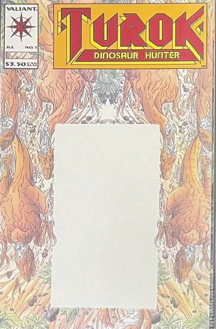 . How Turok came to be separated from his friend Andar and end up in a new time and new world with a technological-enhanced dinosaur named Mon-Ark in pursuit is told in "Cold Blood Blazing." Script by David Michelinie and art by Bart Sears & Randy Elliott. Cameos by Magnus Robot Fighter, X-O Manowar, Rai, Archer, Shadowman. Embossed cardstock cover with chromium strip and red foil logo. Possibly Gonzalez did the chromium strip coloring while VanHook did the background coloring. The chromium strip is an affix.