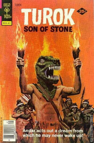 Pic 1: "35 ct" on cover. Pic 2: Preliminary original cover art. Pic 3: "30 ct" on cover. Andar has dreams of home in "Dream On, Andar." When Turok is captured and forced to share his secret of poison arrows, Andar's dreams reveal a way to free Turok. Then, in "Night Of The Honkers", the evening sky turns red, and somehow causes the honkers in Lost Valley to become more aggressive than usual. Turok and Andar must find a way to survive the night, when even fire will not hold honkers at bay.