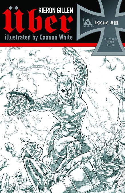 The explosive end of the second arc turns everything you know upside down! This issue is what this has all been building towards - Hitler's secret plan, Churchill's massive new Ubers, and a stunning assault that threatens to change the face of the war. Prepare for one jaw-dropping shock after another as Kieron Gillen's masterpiece rockets into high-gear! Available with Regular or Wraparound cover by Caanan White, Propaganda Poster cover by Michael Dipascale, and a special Blitzkrieg Incentive cover by Caanan White
