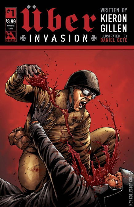 Kieron Gillen's reimagining of superpowers and history is back with America under attack! In the waning days of World War II, the Germans discovered a way to enhance soldiers into unstoppable monsters. With these weapons Hitler conquered all of Europe and now has set his sights on the United States. This is Uber: Invasion! The German battleships are on American soil and with the allies struggling to make up lost ground in Enhanced Soldier development; the young country is facing the possibility of annihilation! Available with Regular, Wraparound, War Crimes, and Blitzkrieg covers by series artist Daniel Gete, a painted Propaganda Poster cover, and a limited VIP Premium cover by Gabriel Andrade that is limited to 500 copies!