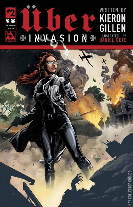 Kieron Gillen's Uber: Invasion is here! America's formerly unassailable shores are burning, the White House is a scorch mark, and the Nazi war machine is rolling over the world. The horror of global war is intensified a thousand times over as living weapons with more power than atomic bombs level everything in sight. World War II is dangerously close to wiping out the human race and the Allies have all but been broken. Is there a way to turn back the tide against a German onslaught that seems to be a step ahead of everyone in the creation of Ubers and their deployment? Available with Regular, Wraparound, War Crimes, and Blitzkrieg covers by series artist Daniel Gete, a painted Propaganda Poster cover, and a limited VIP Premium cover by Gabriel Andrade that is limited to 500 copies!