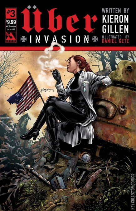 The USA is on fire. Germany's master plan has struck at the very heart of the remaining Allied power. And now as the West burns alongside Europe, hope that this miserable conflict will end fades away. It seems that global dominance is within the reach of the Nazis. Can anyone turn the tides or is this the final wheezing gasp of a world on the precipice of expiring? Available with Regular, Wraparound, War Crimes, and Blitzkrieg covers by series artist Daniel Gete, a painted Propaganda Poster cover, and a limited VIP Premium cover by Gabriel Andrade that is limited to 500 copies!