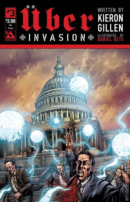 The USA is on fire. Germany's master plan has struck at the very heart of the remaining Allied power. And now as the West burns alongside Europe, hope that this miserable conflict will end fades away. It seems that global dominance is within the reach of the Nazis. Can anyone turn the tides or is this the final wheezing gasp of a world on the precipice of expiring? Available with Regular, Wraparound, War Crimes, and Blitzkrieg covers by series artist Daniel Gete, a painted Propaganda Poster cover, and a limited VIP Premium cover by Gabriel Andrade that is limited to 500 copies!