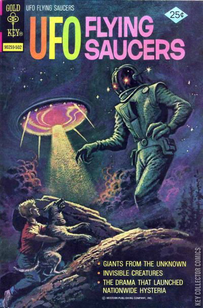 Cover code: 90259-502 The Virginia Giant!!!, 6 pages: While on a camping trip a young boy and his dog see a giant emerge from a UFO. Escape, 2 pages Who Flies the Saucers?, 2 pages The Invisible Thing!, 3 pages The Maury Island Mystery, 6 pages UFO Casebook, 2 pages The War of the Worlds, 4 pages: The story of Orson Welles' radio broadcast and the panic that followed.