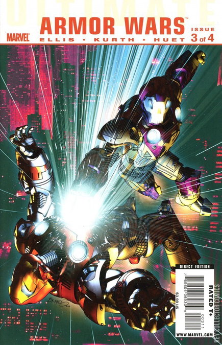 ULTIMATE ARMOR WARS PART 3 Iron Man battles Bram Velsing, the man who purchased the stolen Stark tech data from Doctor Faustus. After a quick and embarrassing fight, Velsing surrenders. Unfortunately for Velsing, Iron Man isn't looking for a prisoner, and after getting the information on where Velsing sold the Iron Man technology (the British), Iron Man lets him die in his suit. Going to England, Iron Man finds out that the British Police have used the technology to make an army of anti-riot squads, to hold up protests from the government's environmental choices. Tony Stark quickly gets into his damaged Iron Man suit, and gives his partner, Justine Hammer, a specific mission to help in the attack. Iron Man flies down to the streets of Britain, where he finds all the riot Police in modified Iron Man suits. Iron Man immediately attacks them, but is unaware of what weapons they possess. The Police attack, and the battle quickly engages in explosives and bullets. The fight goes up to the sky, as Iron Man flees from incoming rockets. Iron Man tries to contact Justine, but doesn't get a response. As he is able to hold off the police, killing most of them, Iron Man flies low through the city. Getting shot at once again, Iron Man appears to be losing the upper-hand, if he ever even had one. Looking away to his attackers for a second, and then looking to back to the direction he was flying, he comes face-to-face once again, with the Ghost. The Ghost is able to knock Iron Man off-balance, and Iron Man skips off a few buildings, falling into the river...