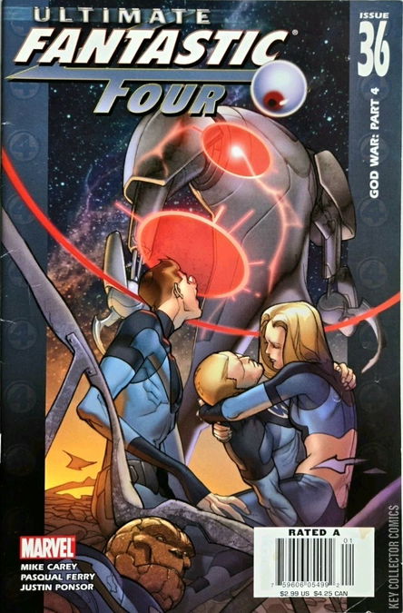 GOD WAR PART 4 The Fantastic Four have crash landed on the planet Pyx. Johnny is extremely weak and cannot flame on. Reed is in special handcuffs. Tesseract is unconscious and in need of medical attention. Ben is nervous and bemoans the teams luck only to be chastised by Sue. Sue then realizes that Dreamcatcher is inhabiting Johnny's body. Dreamcatcher comes out of Johnny's body. She takes the team to a torture facility that is full of technology. Reed frees himself. Ben and Dreamcatcher leave to find energy sources for Tesseract.� Thanos has returned from a long commune with death. He tells his minions that four aliens have survived the crash (from last issue). One of the aliens, in particular, is of extreme importance to him. Thanos has the to transmit his consciousness into other beings, and slowly drain their life force and does so with one of his followers.�� On Planet Halycon, by the World Tree, Darien and another being discuss that they must balance the evil of Thanos and defeat him. Back on Pyx, Ben witnesses a family about to be executed by Thanos' troops. He cannot stand idly by and violently disrupts the proceedings. Ben and Dreamcatcher hurriedly run back to the rest of the team. They explain what has happened. Dreamcatcher notes that Thanos' forces have the technology to quickly track them. Suddenly, Thanos takes control of Ben's body. Thanos tells Reed that the two need to talk.