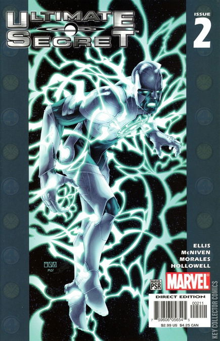 ULTIMATE SECRET PART 2 After an attack on the shuttle Asis, Mahr Vehl comes flying out of the smoke holding the nuclear-energy device above his head. Mahr Vehl brings the device to one of the military vehicles, telling the driver to bring it to the vehicle assembly building. Mahr Vehl takes off once again after the killform that caused all the destruction. Mar Vehl tackles the extra-terrestrial being, deactivating and destroying the killform, passing out from exhaustion. Mahr Vehl wakes up in an interrogation room, a plastique explosive strapped to his neck. Carol Danvers holds the remote, telling Mahr Vehl that after they couldn't figure out how to remove his armor, they strapped that to him. Mahr Vehl complies, revealing that his armor comes off with the device on his wrist. Danvers is shocked to find Lawson under the armor, convinced it is only a guise. Lawson explains he made the suit as a hobby and based it off the Tony Stark design and received the technology by hacking into S.H.I.E.L.D. Danvers refuses to believe Lawson, threatening to interrogate him on a surgical level. Lawson complies once again, this time telling Danvers he is Mahr Vehl is a captain of the Kree Void Navy and would like to speak to Nick Fury. Lucky for Mahr Vehl, Fury is already in the compound, ready to take hold of the interrogation. Fury takes Danvers out of the room, getting an update on Lawson's story. Now believing him to be part of a Native American tribe, Fury gets the entire story straight, learning that Mahr Vehl comes from the Kree race, one of 12 living on planet earth. The Kree do not live on Earth but slightly off-world because of how savagely humans act. Mahr Vehl is just there to observe and make sure humans do not develop the ability to leave Earth as the Kree are there to watch the human race die. Mahr Vehl mentions the name Gah Lak Tus, a name Fury heard before but has kept it secret from all divisions. Fury leaves the interrogation room, promoting Danvers to his personal aide and asking her to contact Reed Richards, Sue Storm, and Tony Stark. In the Baxter Building, Reed Richards is working on the Drake Equation to determine how many races of aliens that they can expect contact with. From Reed's calculations, they figure there has to be a paradox because there are too many alien beings out there. Sue Storm comes to the conclusion that there is a force out there that destroys a race before it becomes technologically advanced to where they can initiate contact. As Sue and Reed get intimate, the phone rings, both of them racing to the receiver. Sue answers the phone, her father on the other line. Franklin Storm tells her they are to have an escorted flight to the Triskelion. The Fantastic Four gather, hopping in the Fantasti-Car and rising above the Baxter Building, waiting for their escort. To their surprise, their escorts are two of the Ultimates, Iron Man and Thor.