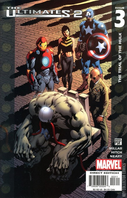 THE TRIAL OF THE HULK Bruce Banner is currently engaged in what is being called a "fair" trial by jury in the very same city in which he had killed so many as the Hulk. Matt Murdock is offering his services as a lawyer who specializes in metahumans. The Ultimates team are forced to watch only from a television screen. Thor is touting the trial as a distraction to a more alarming situation involving future Ultimate deployments from the United States government. And Nick Fury once again proves that he is the most cold hearted man on the planet. Fury drugs Banner. Hank Pym is responsible for keeping Banner sedated. Pym creates a scenario where Banner is victim to a nuke only a few feet away from him. Banner wakes up and his eyes glow just before the explosion. Hank Pym gets a phone call from someone (Bruce Banner?) saying thanks.