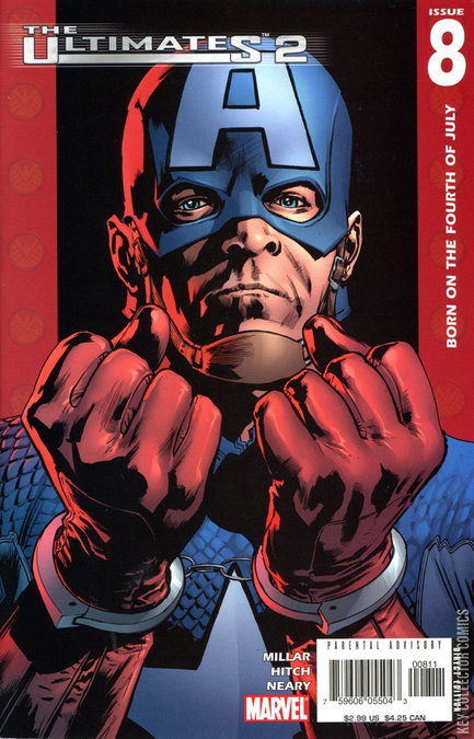 BORN ON THE FOURTH OF JULY Janet wakes up, seeing Steve still awake. Steve said to her that he hasn't slept all night and reveals that he knows about Janet's affair. The two then heatedly argue about their failing relationship due to their personal differences. When Janet stated that she didn't slept with Pym, Steve runs off. S.H.I.E.L.D. investigates the Barton's house finding Laura Barton, Callum Barton, Lewis Barton, and Nicole Barton, Clint Barton's entire family, all dead, with a missing Hawkeye. Nick tells the men at the Triskelion to check the secret security tapes Nick had placed, to see if the killer was caught on tape. Nick asks what they see. The men just stare at the screen, shocked. Steve is with Bucky at his home. Steve tells Bucky that he has no other friends, no family, other than him. The two console with each other and go to the cemetery. Nick prepares to release the Ultimate Reserves, and go after Steve Rogers, who they believe, and saw, killed Hawkeye and his entire family. At Greenwood Cemetery, Steve and Bucky are talking about their lives. Steve relates that he shouldn't have been brought back to life in a America where he doesn't anymore. Though, Bucky interjects that he is still remembered in which a memorial was dedicated to him up to the 1960s. Steve stops, hearing some leaves break. Immediately, the Ultimate Reserves attack Steve, shooting him with dozens of tranquilizers. One of the Rocketmen takes Bucky safely out of the chaos, and the rest begin to beat Steve down. Nick walks over, punching him in the face. Berating him that he is not the real Captain America and being responsible for the deaths of Hawkeye's family. Nick leaves before he goes crazy and kills Steve. As he walks away, Steve grabs a tombstone, and bashes it on one of the Reserves. He then beats down the soldiers, and runs for the helicopter. One of the Rocketmen is flying in the air. As Steve runs into the helicopter, the Rocketman flies Steve into the ground. The Ultimates hear of what is happening and are shocked. Steve is down, lying in front of his statue memorial that was previously mentioned by Bucky.