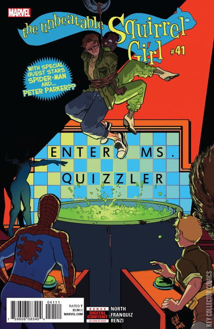 POP QUIZ • In the past months, Squirrel Girl has battled Kraven, rescued NYC from supernatural silence, kinda-maybe died and also fought Skrulls! So now it’s time for a nice break…which is why in THIS issue, Squirrel Girl does nothing but watch public domain movies on television! • That’s right! She just sits there! You can kinda see the TV screen over her shoulder in a couple of panels, but that’s it! It’s really quiet and relaxing and nothing much happens. • … • …THAT IS, UNTIL NANCY WHITEHEAD AND ANOTHER ESU STUDENT BY THE NAME OF PETER PARKER ARE TAKEN HOSTAGE BY A SUPER VILLAIN INTENT ON PROVING THAT SHE’S THE SMARTEST PERSON ON THE PLANET! • Then it’s super hero battles featuring THOR and SHE-HULK on a DATE! SQUIRREL GIRL matching wits against MS. QUIZZLER! And MORE! • Artist Naomi Franquiz makes her MARVEL DEBUT in a stanalone adventure you won’t want to miss!