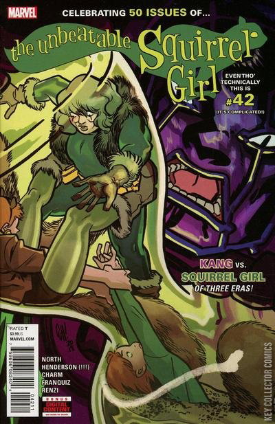 CELEBRATING 50 ISSUES OF SQUIRREL GIRL! It’s the 50TH ISSUE of THE UNBEATABLE SQUIRREL GIRL! That’s right: this issue — #42 — is our 50th! It says #42 on the cover, but that’s only because we had eight issues, and then a second #1 in our first year, although this of course doesn’t count the OGN (SQUIRREL GIRL BEATS UP THE MARVEL UNIVERSE), which is another five issues of story, which would put us at... issue #55? This is getting complicated. Anyway! By a certain way of counting, it’s our 50TH ISSUE of THE UNBEATABLE SQUIRREL GIRL! And to celebrate, we’re doing a stand-alone story in which she takes on none other than... KANG THE CONQUEROR. It’s a battle across space AND time as Kang attacks three distinct eras of Doreen! And it’s not just Kang who is joining us for this celebration! Original UNBEATABLE artist Erica Henderson is joining series regular Derek Charm, along with Naomi Franquiz! THIS IS A REALLY GOOD ISSUE AND WE’RE SUPER BIASED BUT WE THINK YOU SHOULD ORDER IT, THANKS.
