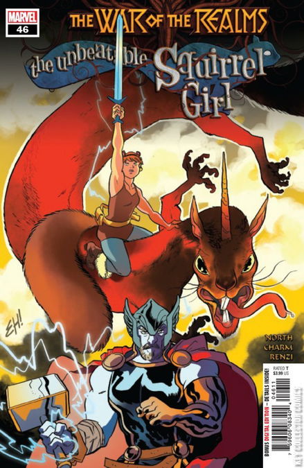 A WAR OF THE REALMS TIE-IN! The MOST squirrel-centric WAR OF THE REALMS tie-in reaches its conclusion! Only one woman stands between the invading army of the Frost Giants and utter disaster on Earth, and that woman is SQUIRREL GI— hold on... hold on, sorry. I’m getting word that not one but TWO women actually stand between the Giants and utter disaster on Earth, and one of them is...RATATOSKR?? It seems unlikely that the Norse god of gossip would be on Team Doreen, let alone a valuable member of it — but hey, stranger things have happened, right? I can’t think of any off the top of my head, but they’ve probably happened. Can SQUIRREL GIRL team up with her SMACK-TALKING ENEMY? Can two people who couldn’t be more different find a common ground in time to save everyone? And will BRAIN DRAIN make it back from the Negative Zone?? You may THINK you know the answers to these questions, but only by purchasing and then reading this illustrated picto-narrative will your suspicions be confirmed or denied!