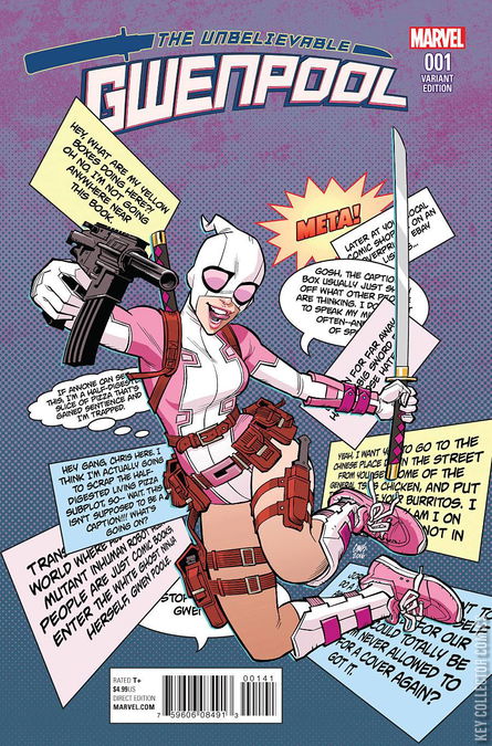 2015’s overnight internet sensation takes center stage in her own ongoing series! Gwen Poole used to be a comic book reader just like you...until she woke up in a world where the characters she read about seemed to be real! But they can’t be, right? This must all be fake, or a dream or something, right? And you know what that means...NO CONSEQUENCES! Could Gwenpool truly be Marvel’s least responsible and least role-modely character to date? She can if she tries!