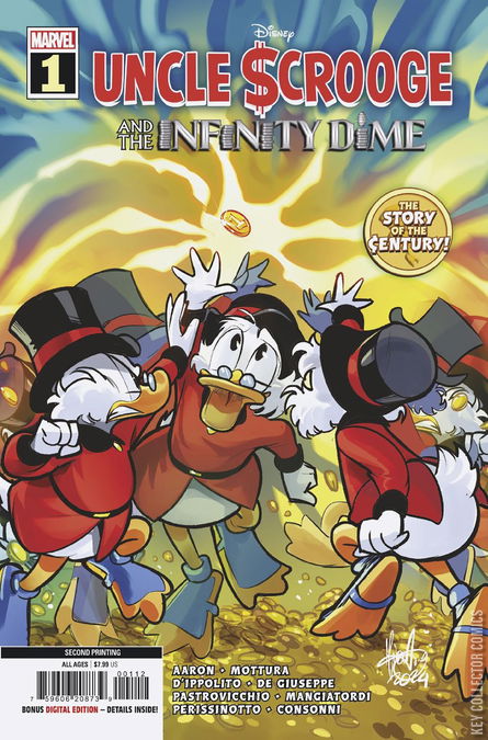 FOR THE FIRST TIME EVER, MARVEL AND DISNEY TEAM-UP TO BRING YOU THE STORY OF THE ¢ENTURY! It's the story you never expected! One of the greatest characters in the history of comics leaps into his most epic adventure yet, in the manner only MARVEL can deliver! When UNCLE SCROOGE'S fabled money bin gets stolen by a shocking culprit, the world's toughest duck must undertake a quest unlike any other, alongside a surprising array of allies: other versions of himself! An oversized special, from Marvel mainstay writer JASON AARON (THOR, AVENGERS) and a cadre of celebrated Scrooge artists! Also re-presenting the classic CHRISTMAS ON BEAR MOUNTAIN, the first appearance of Scrooge McDuck by the legendary DISNEY COMICS creator, CARL BARKS!