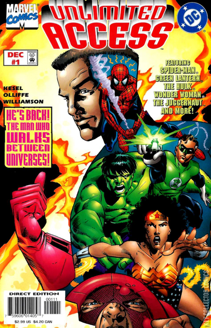 NO TIME LIKE THE PRESENT Access, the young man who can move between the Marvel and DC Universes, discovers that he can now move through time as well—unfortunately, he has no idea how to control this new power! He better get a handle on it real quick, because the two universes are going to war! Featuring Spider-Man and Wonder Woman vs. Juggernaut and the New God Mantis! The Hal Jordan Green Lantern takes on the savage Hulk! Plus: a showdown in the Wild West between Jonah Hex and the Two-Gun Kid! And behind it all—one of the greatest menaces in either universe—and his target is Access!