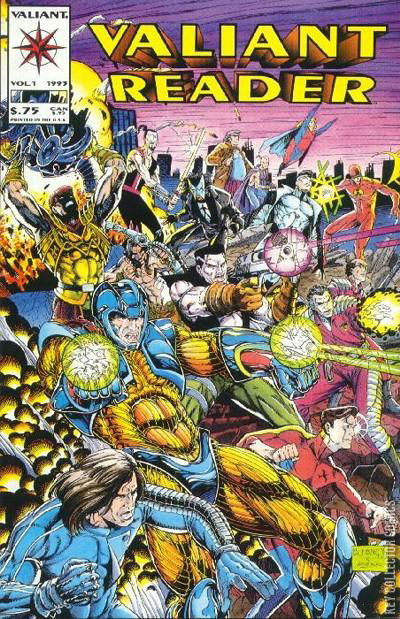 The Valiant Reader introduces the entire line-up of the Valiant Universe. Featuring a two page layout for each title briefly describing highlights of the series. Also displayed is a brief description of three of the main villains of the Valiant Universe and three new titles: The Second Life of Doctor Mirage, Ninjak, and Timewalker.