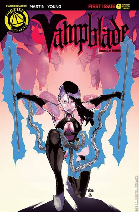 Debuting at Halloween ComicFest and in the pages of Zombie Tramp, the co-writer and artist of Zombie Tramp unleash breakout character Vampblade in her own all-new ongoing series! When a young comic shop employee is transformed by mystical blades into a walking talking (and slicing & dicing) 90s comic book bad girl, she must quickly learn how to survive the new grotesque world the blades reveal. Now, other-dimensional parasites hidden all around us resembling the "space vampires" from the 90s comic, Vampblade, are all too real, and out for her blood! Features regular and incentive "homage", "booty", artist, "90s cheesecake", and "goo" variant covers.