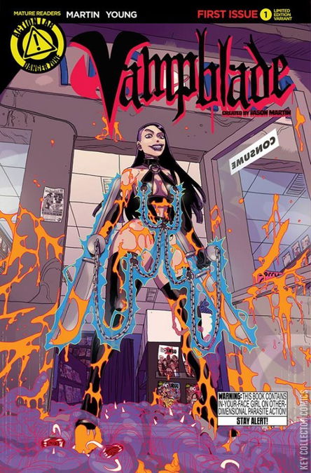 Debuting at Halloween ComicFest and in the pages of Zombie Tramp, the co-writer and artist of Zombie Tramp unleash breakout character Vampblade in her own all-new ongoing series! When a young comic shop employee is transformed by mystical blades into a walking talking (and slicing & dicing) 90s comic book bad girl, she must quickly learn how to survive the new grotesque world the blades reveal. Now, other-dimensional parasites hidden all around us resembling the "space vampires" from the 90s comic, Vampblade, are all too real, and out for her blood! Features regular and incentive "homage", "booty", artist, "90s cheesecake", and "goo" variant covers.