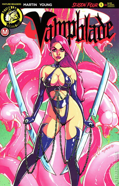 New season! New artist! New costume! Katie Carva is back! Back from an alternate Earth, back from hell, and back to running a comic shop by day, and wielding other-dimensional-parasite slaying bloodthirsty blades by night! Features 3 regular and risqué variants, plus Dan Mendoza (Zombie Tramp, DollFace) plus special incentive and super limited virgin variants! Now with legacy (#38) numbering.