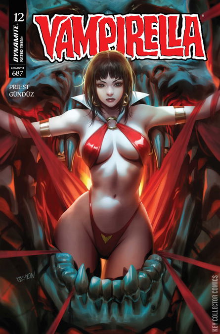 THE MAGNIFICENT VAMPI! Trapped in the 19th century Old West, the Daughter of Drakulon is faced with a stark choice: allow a rural town to be taken over by a deadly gang of blood-sucking lawmen, or use her own Vampiri abilities to save the town, and risk destroying her ability to return home through the resulting timestream interference! Grizzled comics gunslingers CHRISTOPHER PRIEST and ERGÜN GÜNDÜZ strap on their six-shooters for Vampirella #12 — flanked by cantankerous cover artists LUCIO PARRILLO, DERRICK CHEW, JOSEPH MICHAEL LINSNER, ELIAS CHATZOUDIS, and cosplay by RACHEL HOLLON!